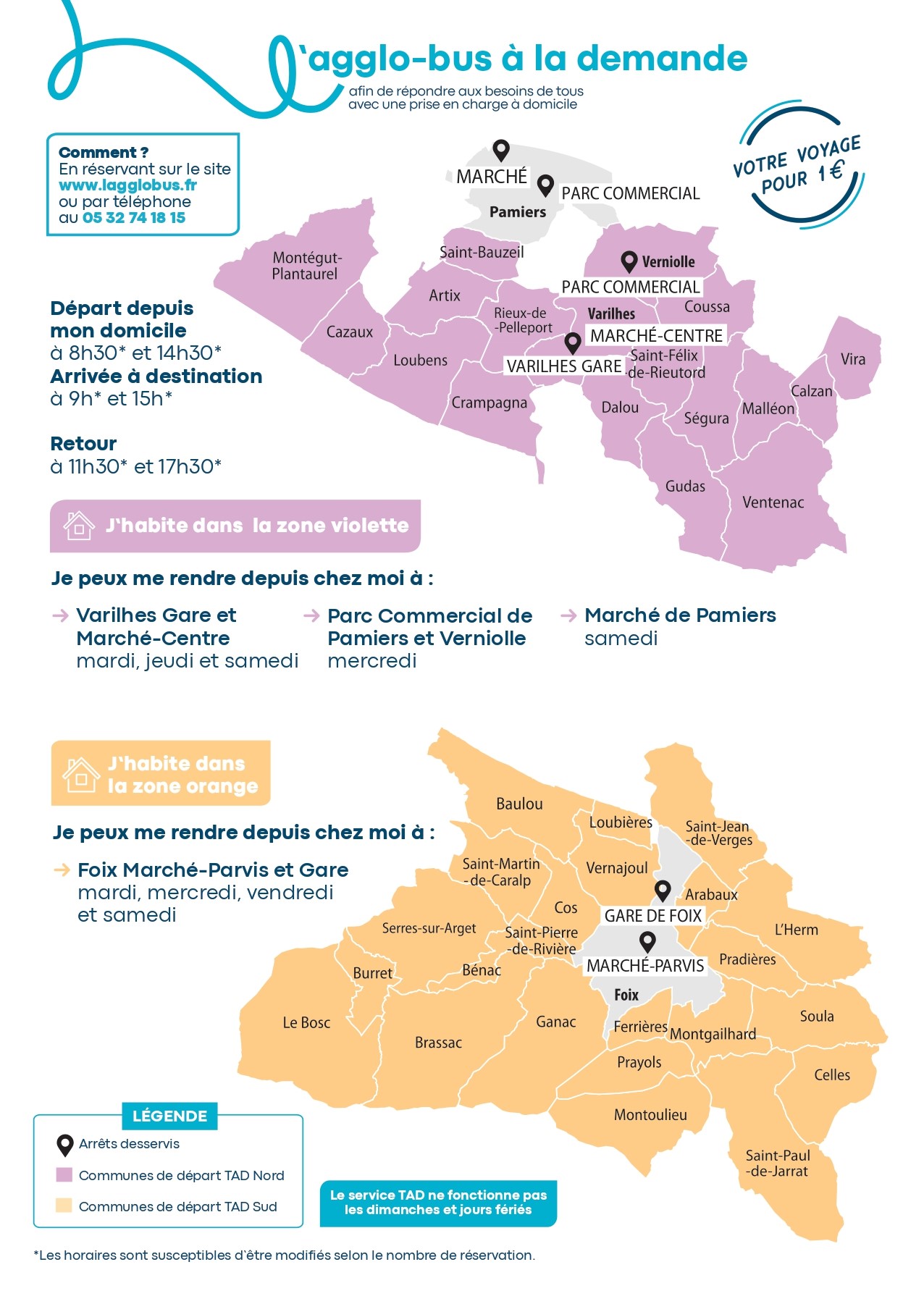 Un service de transport à la demande (TAD) avec prise en charge à domicile est mis en place au moins deux fois par semaine depuis l’enhttp://www.lagglobus.fr)./semble des communes de l’agglo hors Foix. Les réservations peuvent être effectuées jusqu’à 17h la veille des jours de fonctionnement (au 05 32 74 18 15 ou via le formulaire de réservation en ligne sur  https://lagglobus.fr/reserver-son-transport-a-la-demande/