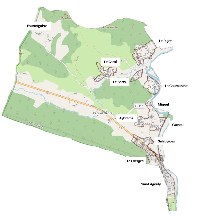 Alors que les hameaux Fourmiguères, Micouleau, Carol, le Barry et le Puget s’implantent sur le secteur Nord du territoire communal, les quartiers-hameaux de l’île de Crampagna (la Coumanine), puis de Miquel, Aybrams, les Verges et Saint-Agouly se trouvent dans le secteur Sud du territoire communal. Ces deux derniers se trouvent particulièrement concernés par le phénomène de conurbation (urbanisation se touchant, sans respiration entre les pôles).